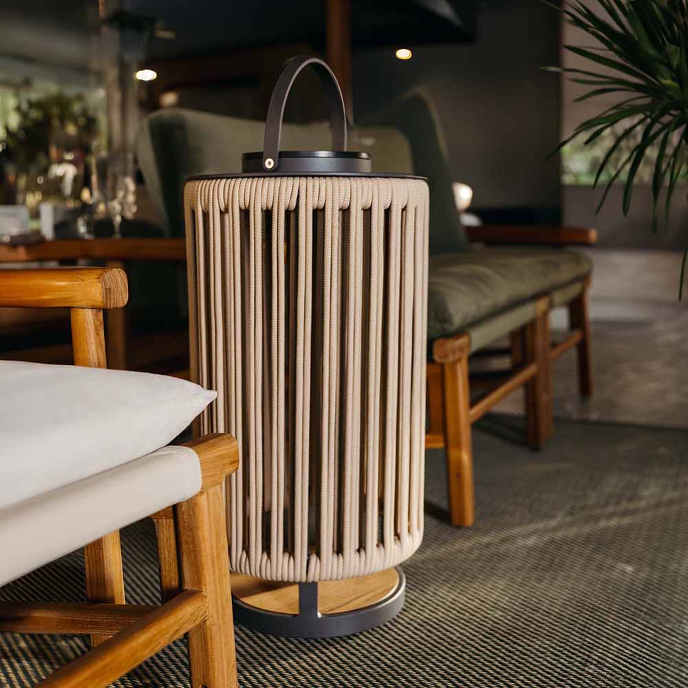Cala is an outdoor lamp made of wood and nautical fabric. Rechargeable and water...
