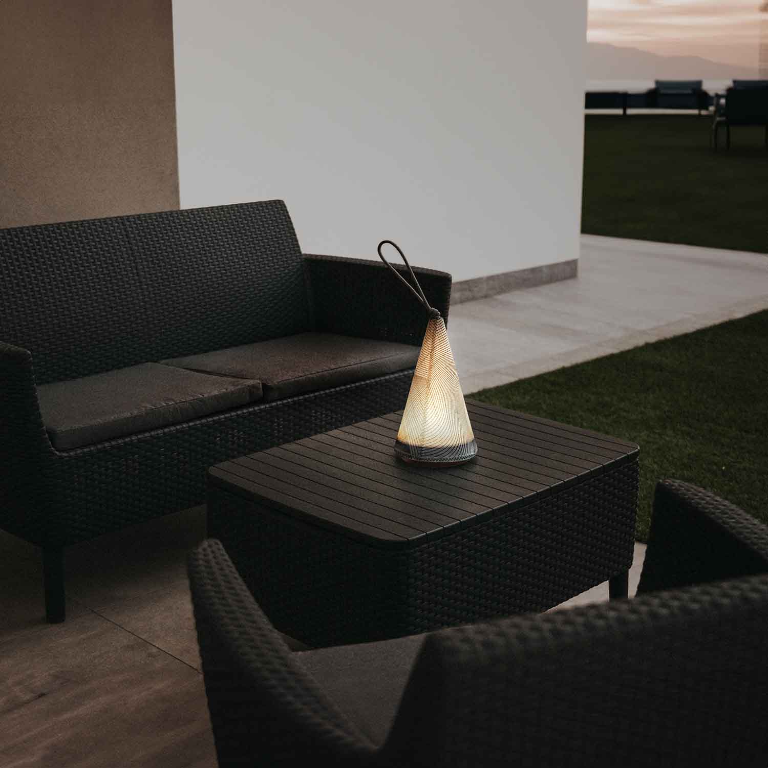 Materials that bring warmth to the eye and to the touch. High-resistance textile fibres that retain their texture and colour even under intense sun and rain. A refined lightness that hides real technical strength – perfect for elegant garden lighting and exterior lights.