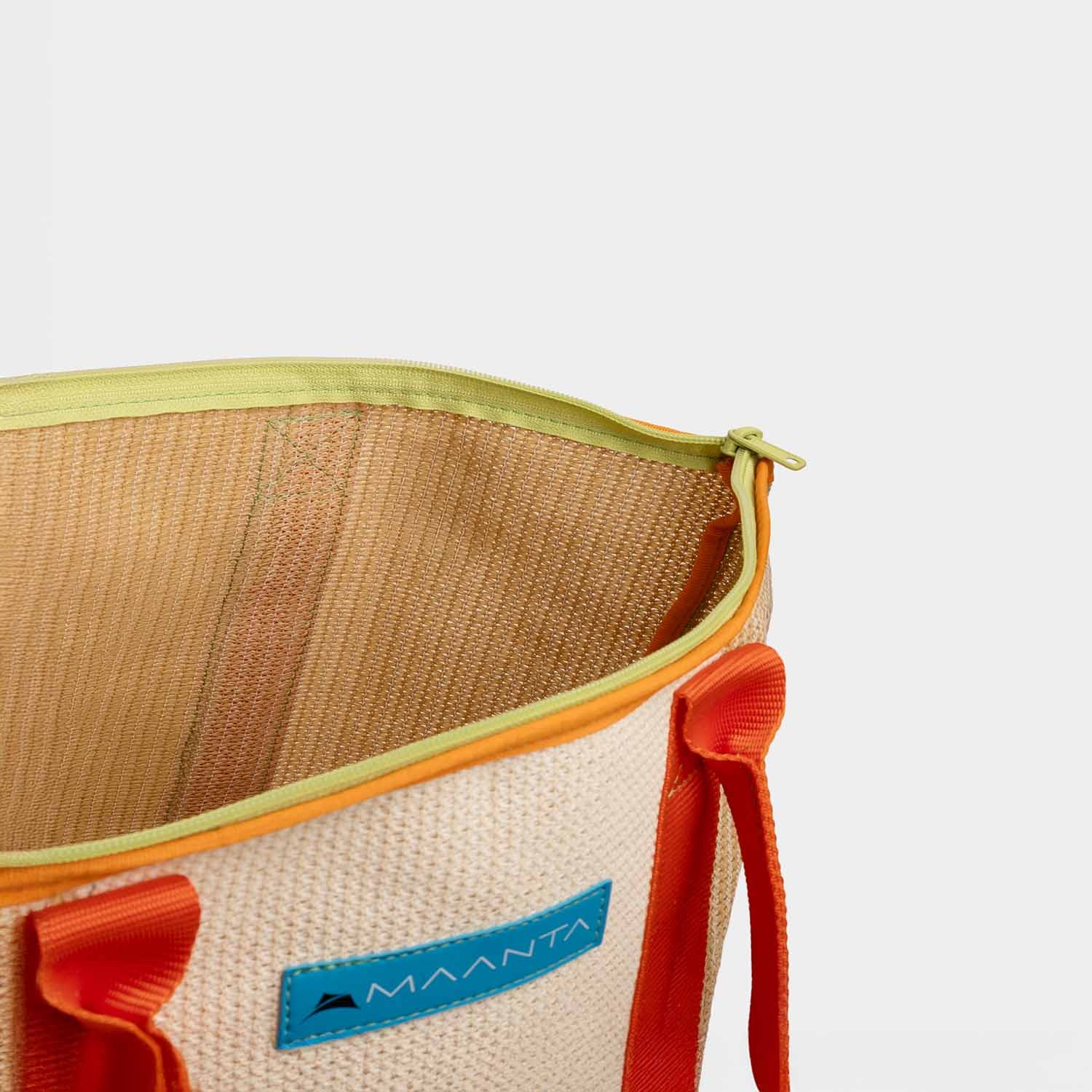 Two-tone beach bag with orange inserts and green and blue details, comfortable fabric handles, top zip closure.