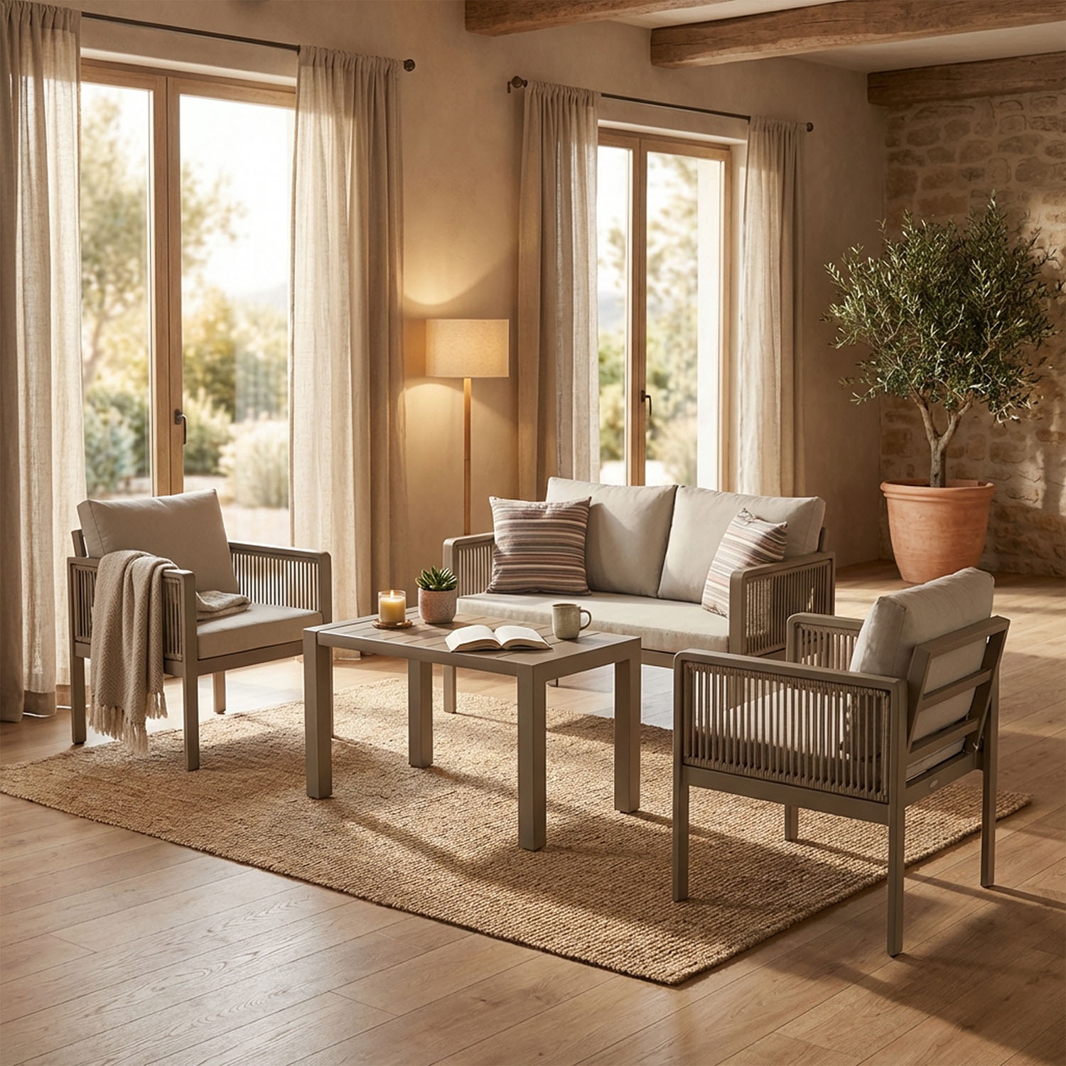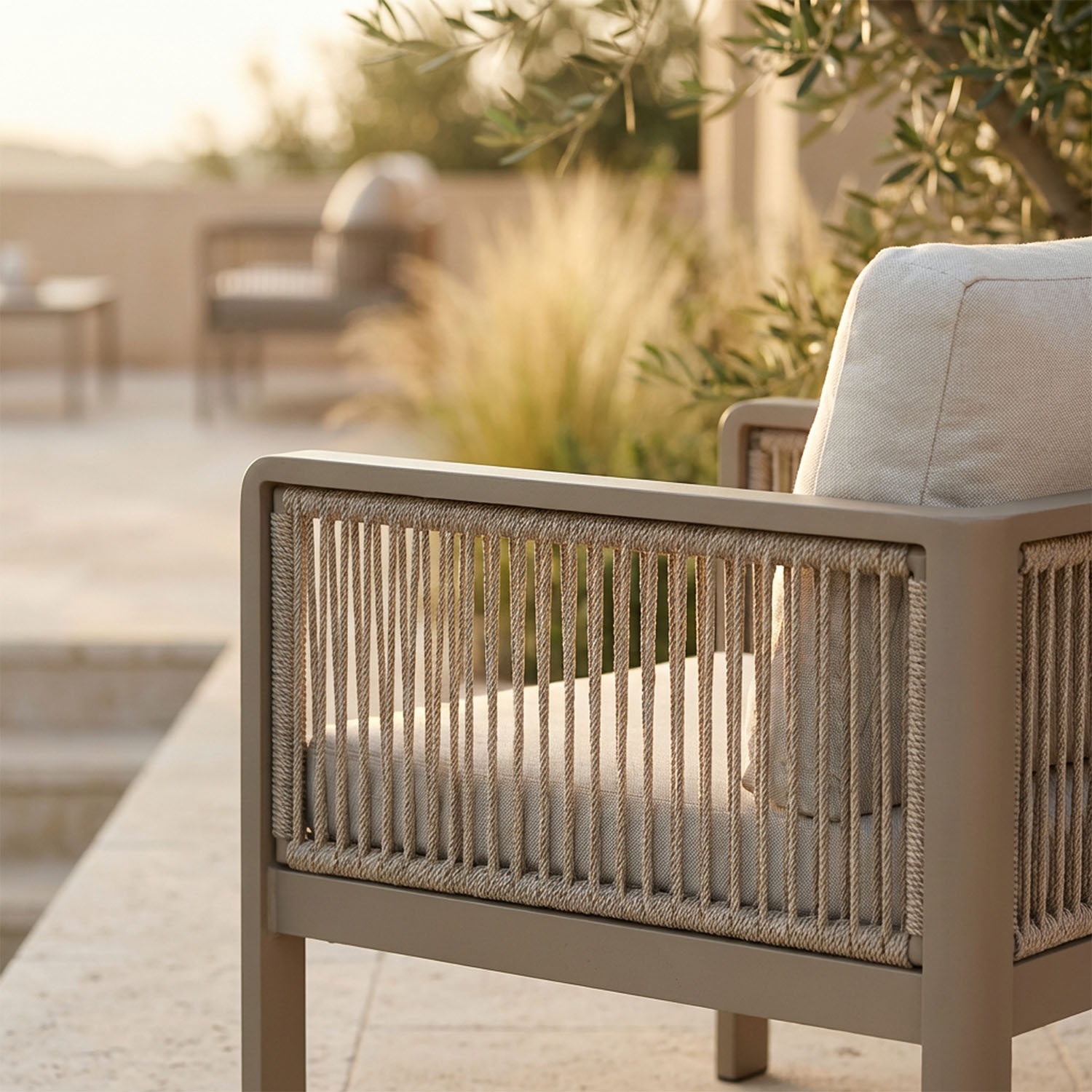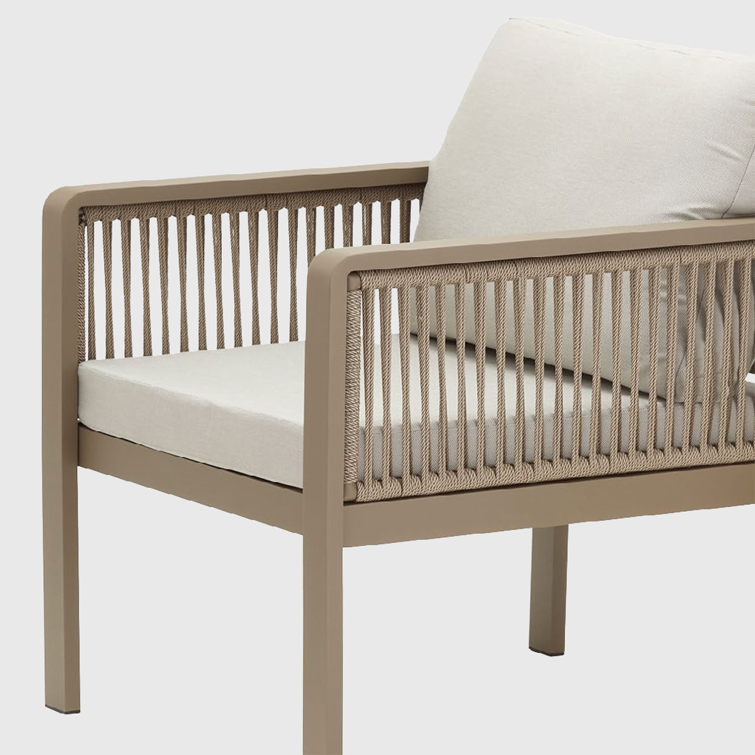 Aluminium is a good thermal conductor, so it can heat up under direct sunlight. In Genova, however, olefin rope wraps the armrests and backrests, creating a natural barrier between the metal frame and your body. The cushions enhance comfort even during the warmest hours, making it ideal for relaxing in British gardens and outdoor living spaces.