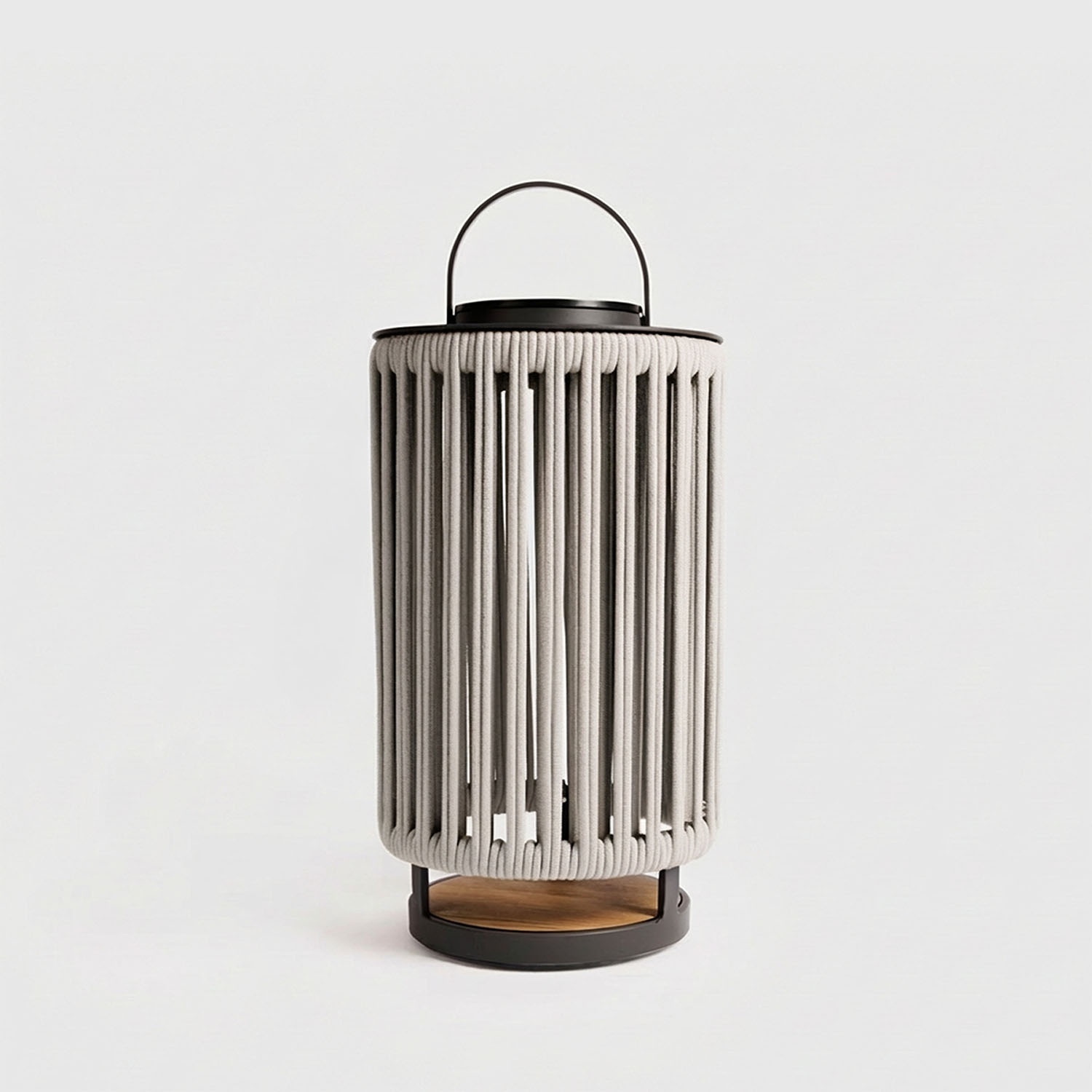 Marinea is a portable solar lamp with a radially braided nylon rope and a teak base.