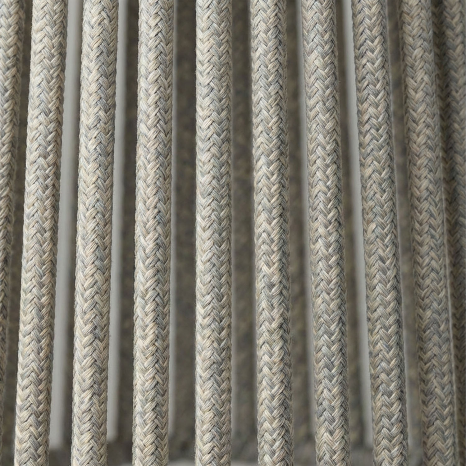 The nylon rope is woven according to a precise radial pattern. When the LED lights up, each ray of light filtering through the ropes draws a sunburst motif on the surrounding surfaces: the table, the wall, the terrace floor. It is not a random effect. It is geometry applied to lighting.