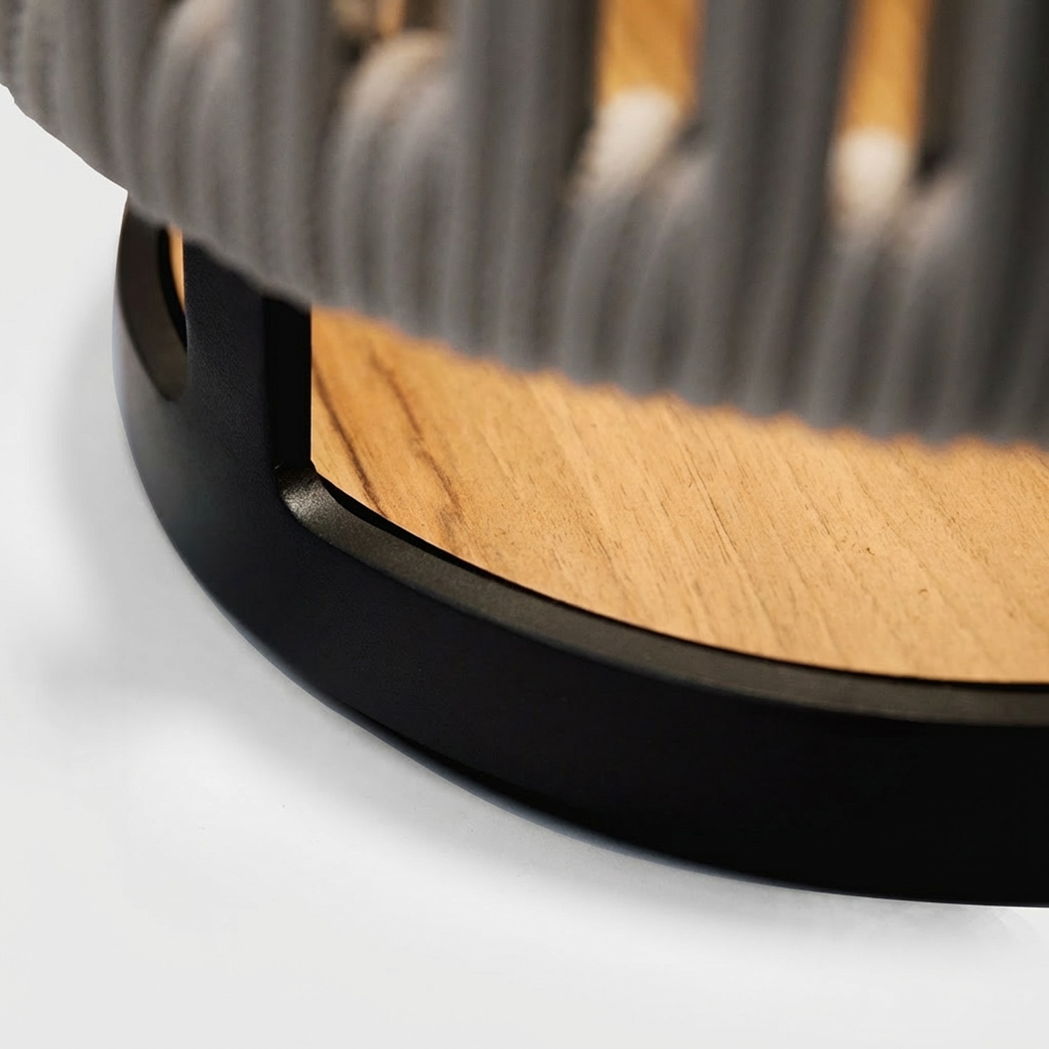The rope is available in four colours: Terracotta, Dark blue, Pebble grey, Olive beige. The aluminium frame is always matte black. The teak base features a natural finish, ideal for British gardens and outdoor living spaces.
