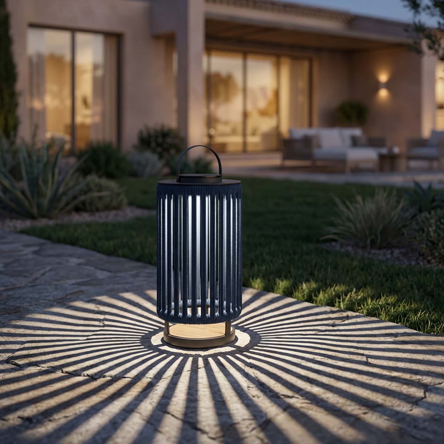 Marinea is a portable solar lamp with a radially braided nylon rope and a teak base.